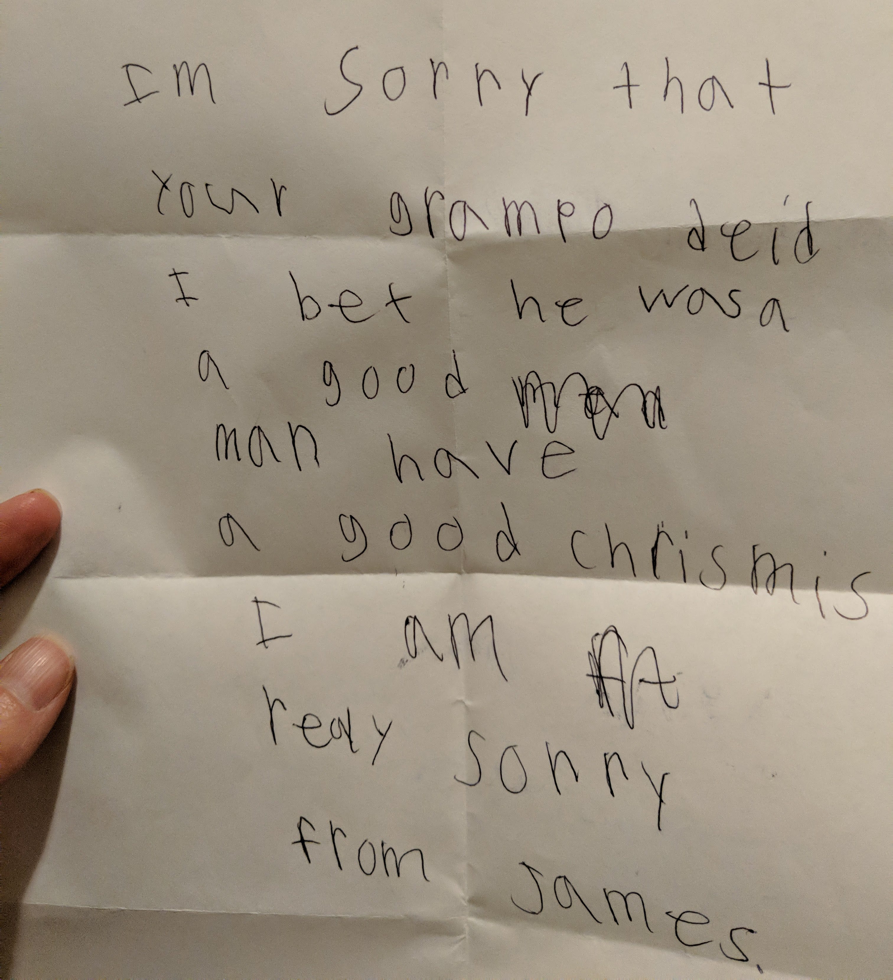 They have no agenda, no relationship dynamics at play, just pure love. Like when my cousin’s 11-year-old son gave me a fidget toy he’d 3D-printed: “I want you to have it.” Or when my 4-year-old niece gave my dad one of her stuffed animals because she wanted him to have it. Or my then-boyfriend’s 7-year-old son who gave me this note—unprompted and unaided by his dad.