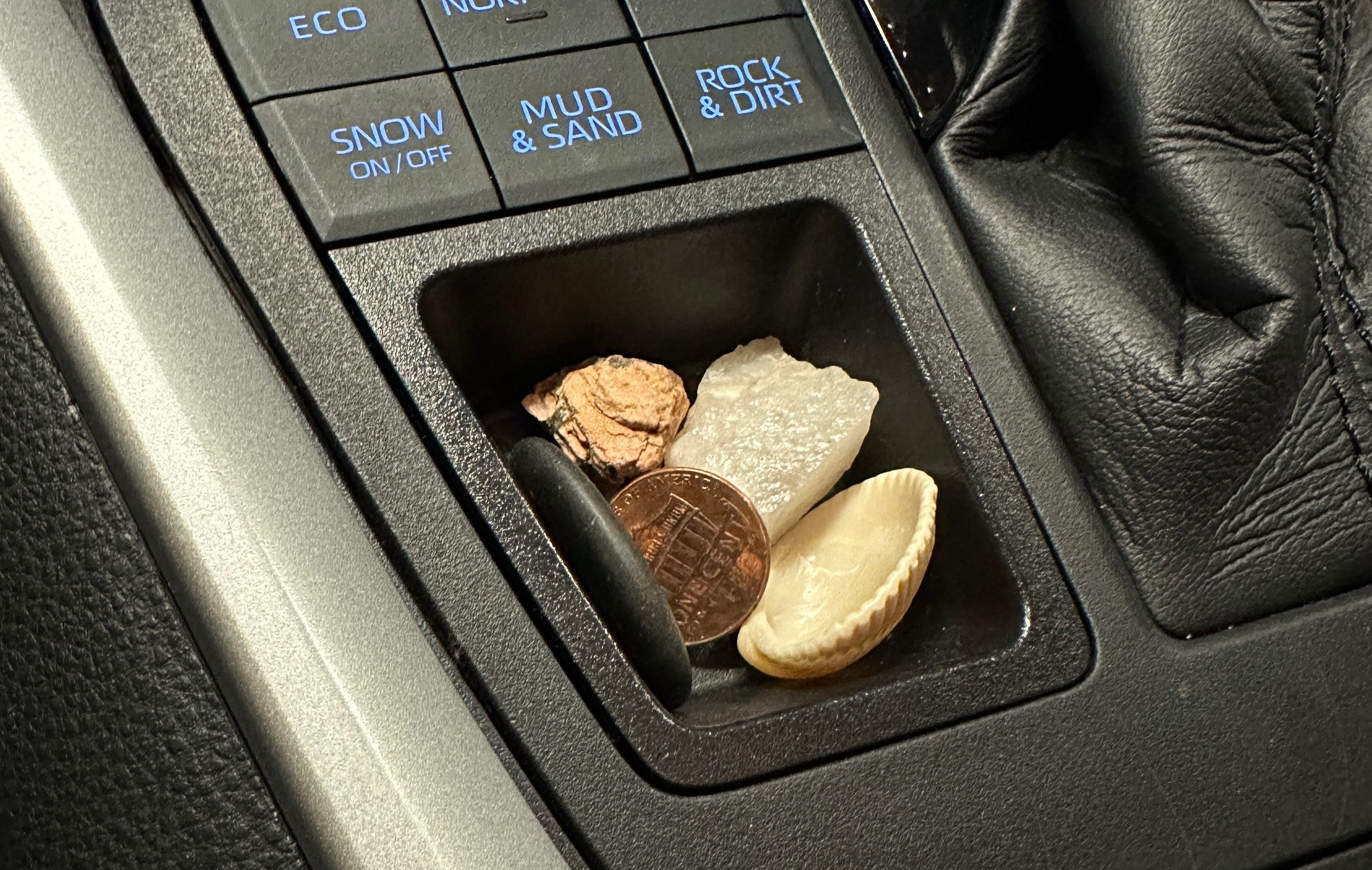 Clothes and shoes and jackets for most potential seasons and occasions. It’s immoral to not have at least one physical book with you at all times, so I have a backpack of books. In my car, I also have a “micro curio cabinet” with a few treasures collected along the way: favorite rocks, a penny from Heaven, a shell from the Wilmington, North Carolina beach.