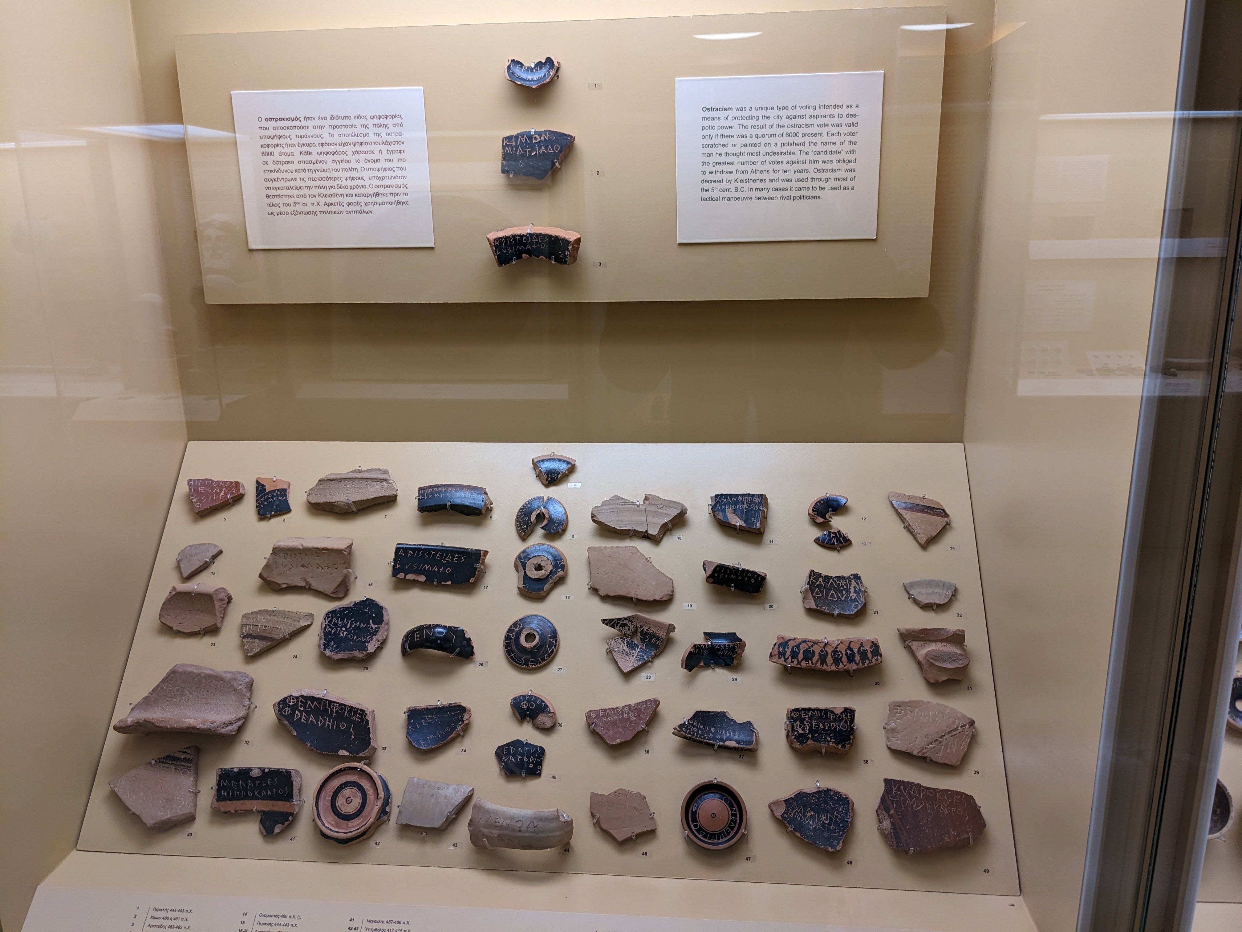 After snapping pictures and trying to get interested in the daily lives of ordinary Athenians as captured in several exhibits, I moved along and stopped when the word ostracism caught my eye. And boy, am I glad it did. Otherwise, I probably would’ve moved right along, assuming we were looking at boring shards of pottery. We were not.